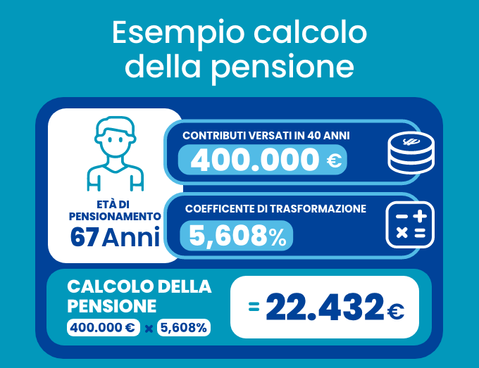 Facciamo un esempio: se nel corso di una vita i contributi versati ammontano a 400.000 euro (ipotesi di un versamento medio di 10.000 euro l’anno per 40 anni, pari a circa un terzo di un reddito annuo lordo complessivo di 30.000 euro per lavoratori dipendenti), la pensione convertirà questa somma in pensione annua vitalizia in base al numero di anni di speranza di vita media di chi va in pensione . Se si va in pensione a 67 anni di età la pensione annua lorda verrà calcolata come segue: