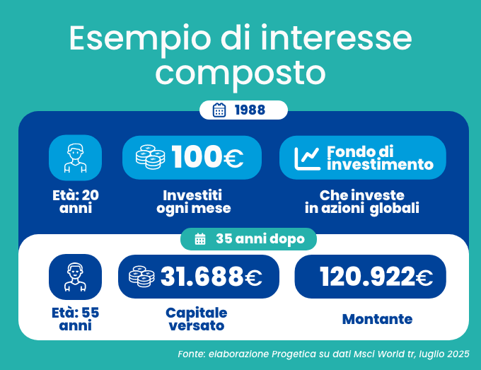 Ben 82,7% dei giovani investitori teme di perdere i propri soldi. Timore legittimo ma che rischia di bloccare l’unico vero vantaggio competitivo che hanno: iniziare presto e sfruttare i benefici dell’interesse composto, sia per l’investimento che per la previdenza. Facciamo un piccolo esempio storico di cosa significa: un 20enne che avesse investito nel 1988 ogni anno 100 euro (al potere di acquisto di oggi) ogni mese in un fondo di investimento che investe in azioni globali avrebbe oggi all’età di 55 anni un montante pari a 120.922€, su un capitale versato di 31.688€ (Dati a luglio 2025 su indice di mercato Msci world tr su performance reali).