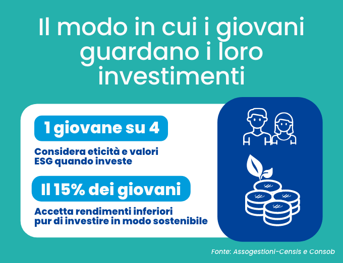 Anche i grandi operatori finanziari segnalano che le nuove generazioni sono più disposte ad accettare rendimenti leggermente inferiori pur di investire in aziende responsabili. Infatti, tra gli italiani informati sui fondi ESG (Consob) , circa il 15% dei giovani è disposto ad accettare rendimenti inferiori pur di investire in modo sostenibile. In questo senso, i giovani appaiono non solo come investitori emergenti, ma anche come i veri protagonisti di una trasformazione culturale che coniuga crescita economica e attenzione verso il pianeta.