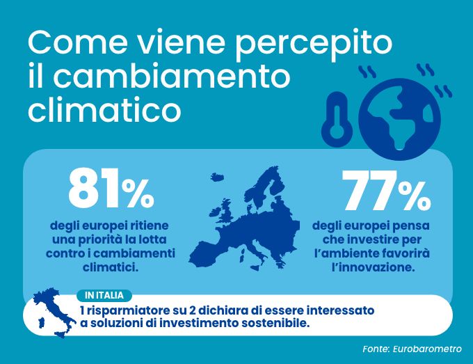 In Europa, i fondi sostenibili raccolgono più della metà dei nuovi flussi di risparmio. Gli italiani sono tra i più interessati, ma ancora poco informati, solo il 23% sa spiegare bene cosa siano i fondi ESG (Consob, 2023). Tra le persone informate tuttavia, circa il 15% degli italiani dichiara di essere disposto a investire in modo sostenibile anche se ciò comportasse rendimenti inferiori rispetto ad altri prodotti finanziari.