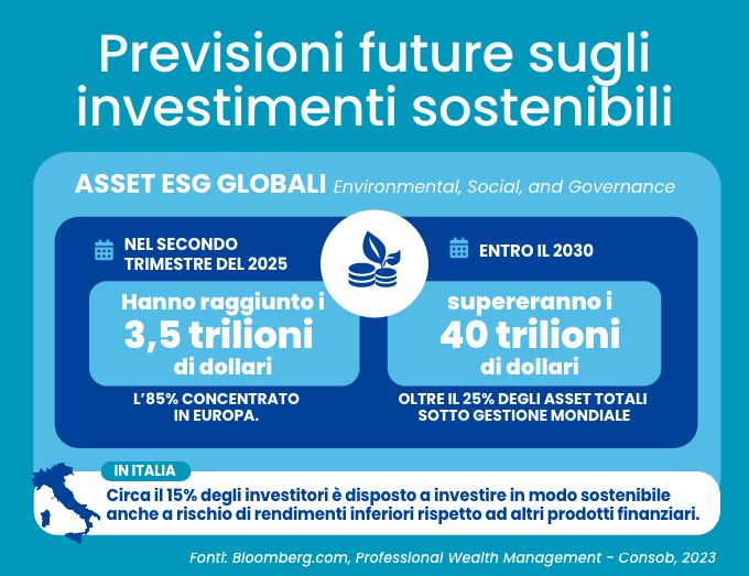 Nel 2024, oltre il 20% dei fondi comuni in Europa rientrava nella categoria “sostenibili” (Morningstar) . Secondo la Global Sustainable Investment Alliance (GSIA), gli asset globali investiti in strategie sostenibili hanno superato i 30,3 trilioni di dollari nel 2022 (gsi-alliance.org). Bloomberg Intelligence prevede che entro il 2030, gli asset ESG globali supereranno i 40 trilioni di dollari, pari a oltre il 25% dei totali asset sotto gestione mondiale (Bloomberg.com, Professional Wealth Management).